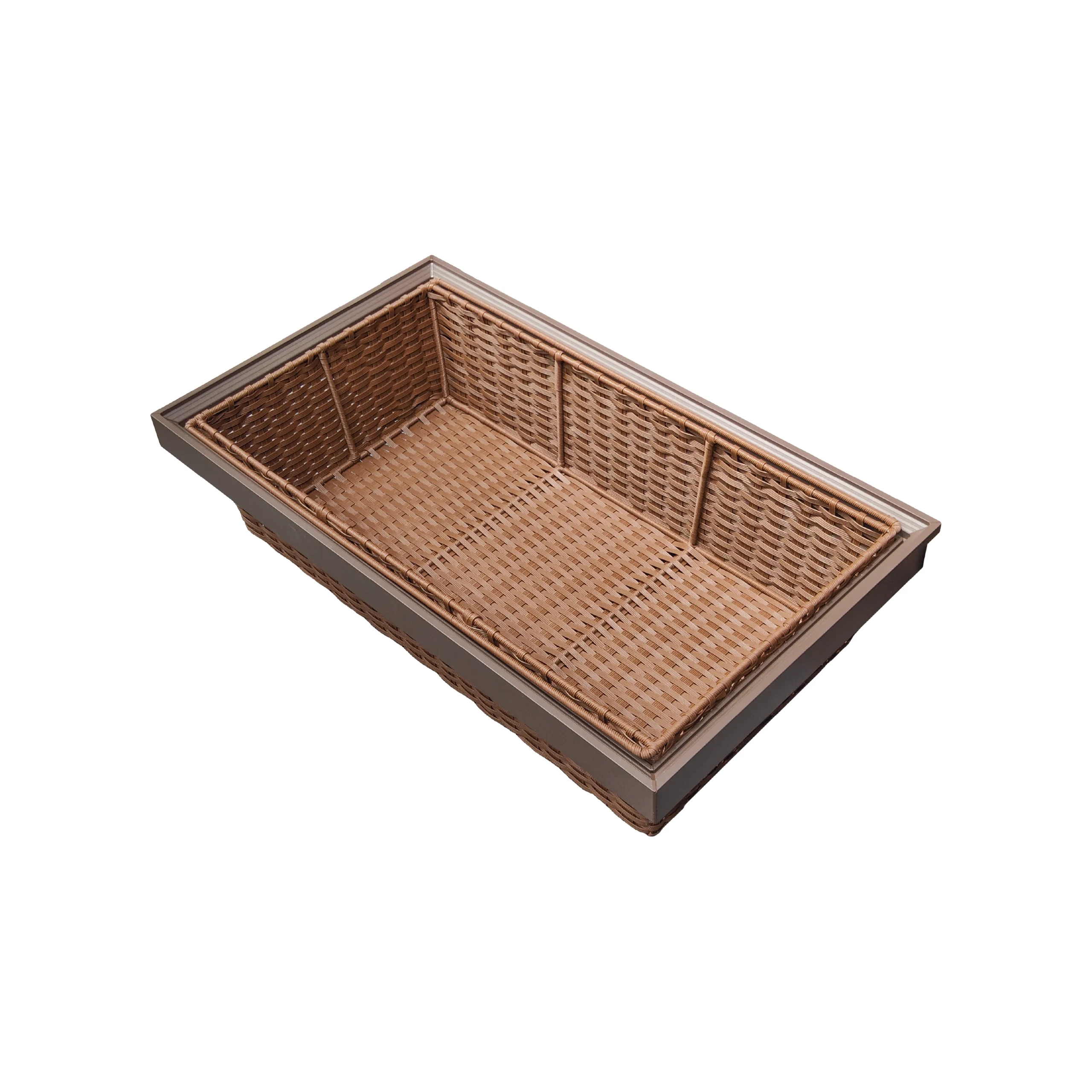 سلة تخزين سحاب منسوجة بإطار معدني متين وتشطيب بني أنيق. حركة انزلاق ثابتة لتنظيم المناشف والملابس والإكسسوارات داخل الخزانة بسهولة.