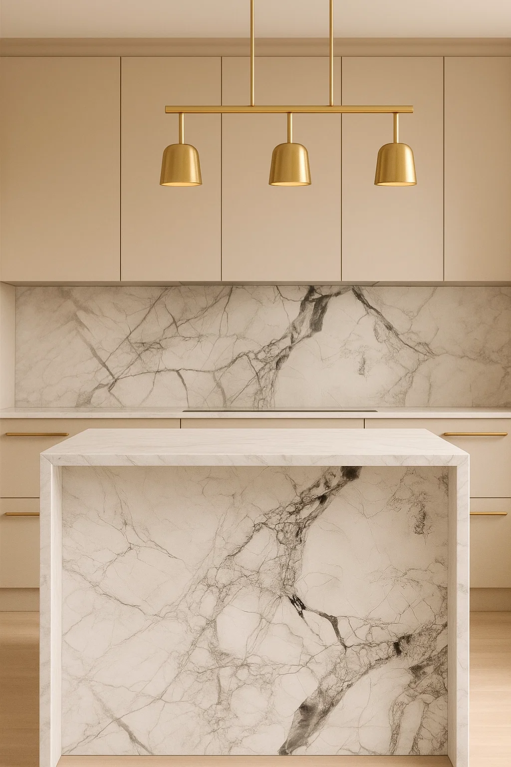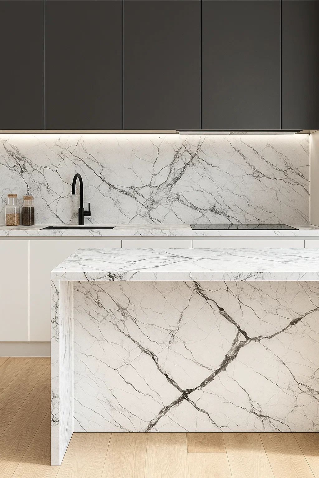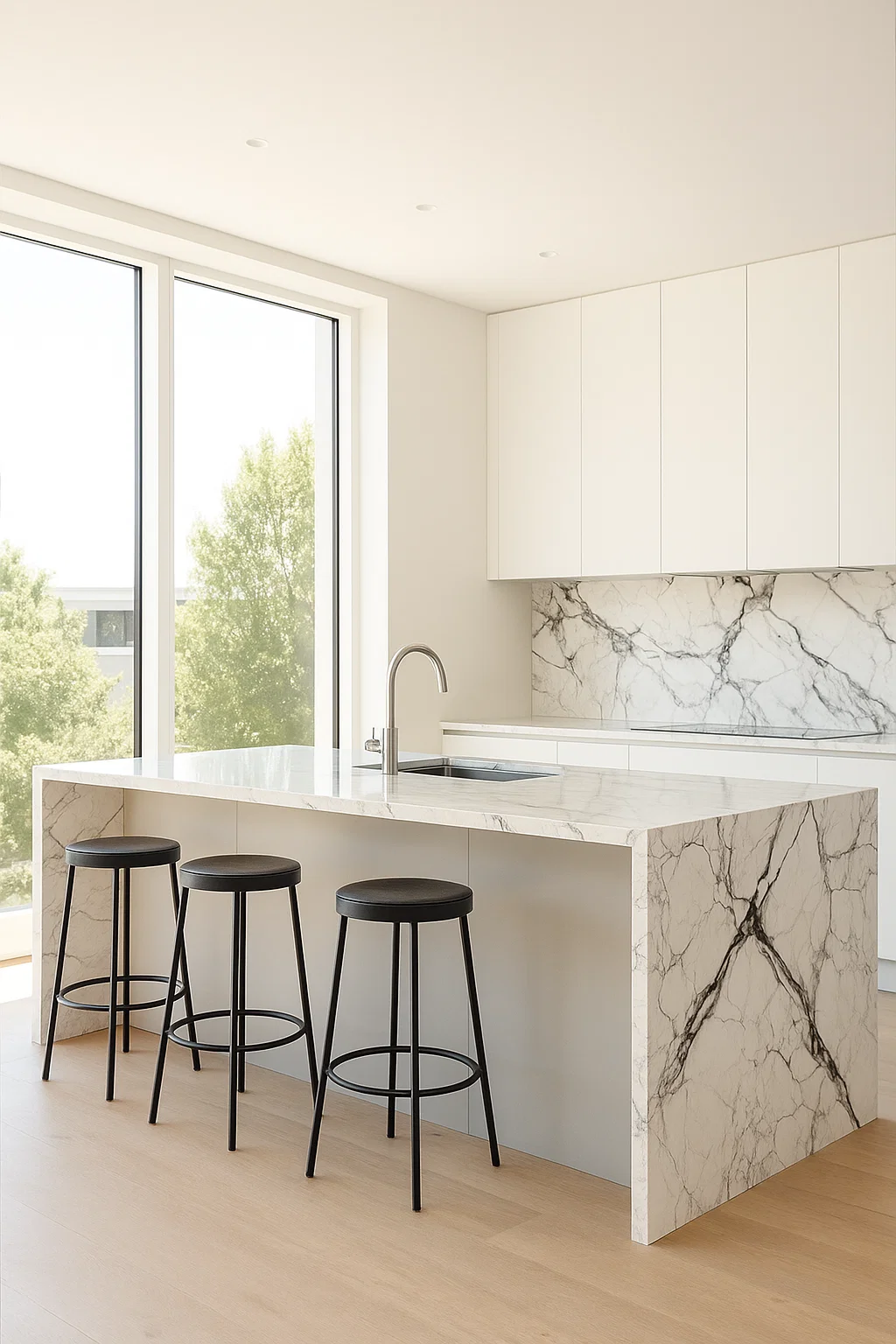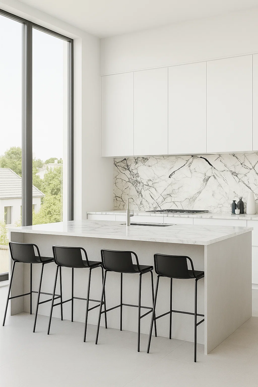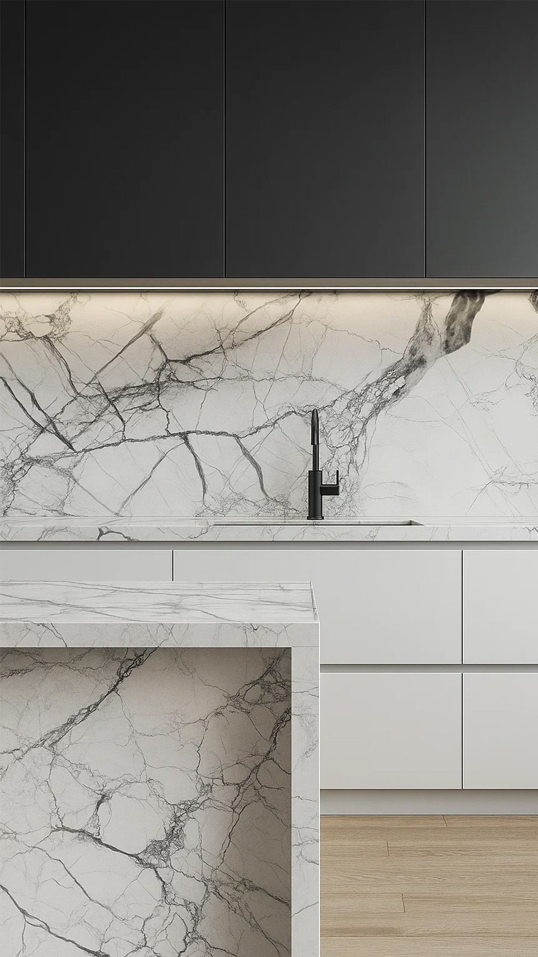White marble countertops with elegant natural veining, adding a modern and luxurious touch to any kitchen. Perfect for those who seek a balance of purity and sophistication.